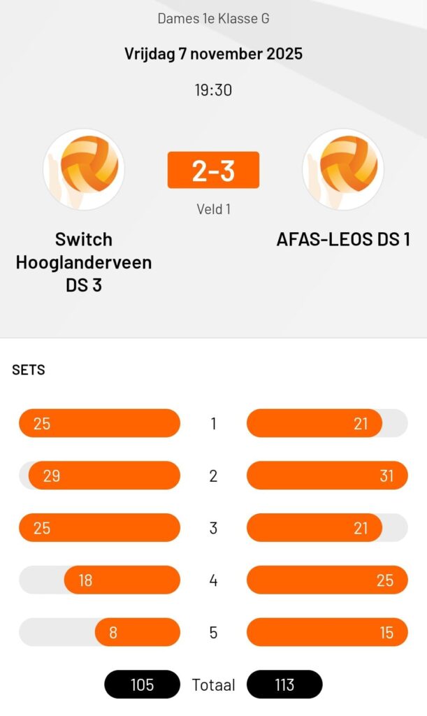 Wedstrijdverslag: Switch Hooglanderveen Dames 3 vs AFAS-LEOS Dames 1 Eindstand: 2-3 winst voor AFAS-LEOS Set